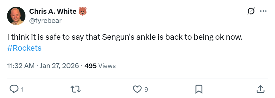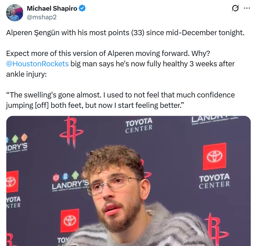 赛后火箭媒体人Chris A. White点出申京状态回暖的核心原因:“现在终于可以说申京的脚踝已经完全恢复健康。”